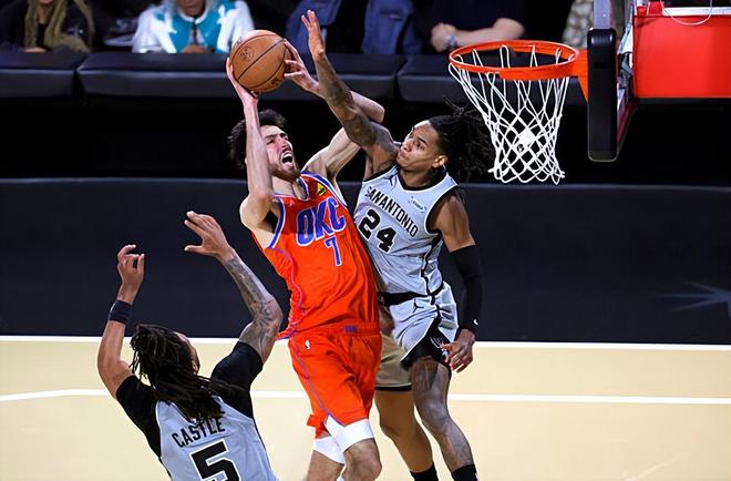 本场比赛中,雷霆虽然输掉了比赛,但是球队的先发大前锋切特-霍姆格伦(Chet Holmgren)的表现还是具备一定的亮点的,不过他也暴露了自己的一些问题。切特全场出场30分28秒,投篮8中3,三分线外3中1,罚球12中10,得到了17分7篮板1盖帽的数据,还有1次失误和3次犯规,正负值为+18。切特在进攻端虽然手感平平,但是他还是在对手内线制造了一定的威胁,并且起到了一定的作用,他也是靠着自己的经验得到了不少的分数。令人遗憾的是,切特虽然在面对卢克-科内特(Luke Kornet)时起到了很好的效果,但是在面对维克托-文班亚马(Victor Wembanyama)时,他在场上的作用就没有办法发挥出来,甚至他在身体天赋方面的优势也是荡然无存了。
